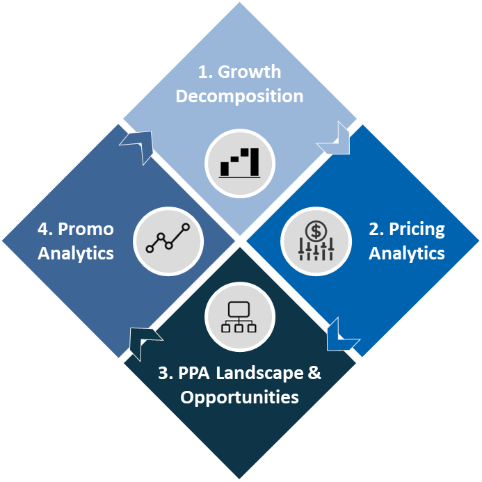 Comprehensive 4-Step Analytical Framework – moving from “I think” to “I know.” MRA implements a robust, data-driven framework to identify growth opportunities and inform strategic direction using advanced mathematical and statistical techniques. By combining growth decomposition, PPA, and price/promo under a unified framework, we create a powerful foundation to unlock incremental growth, optimize portfolio performance, and establish a springboard for sustained, profitable growth in an ever-evolving market.